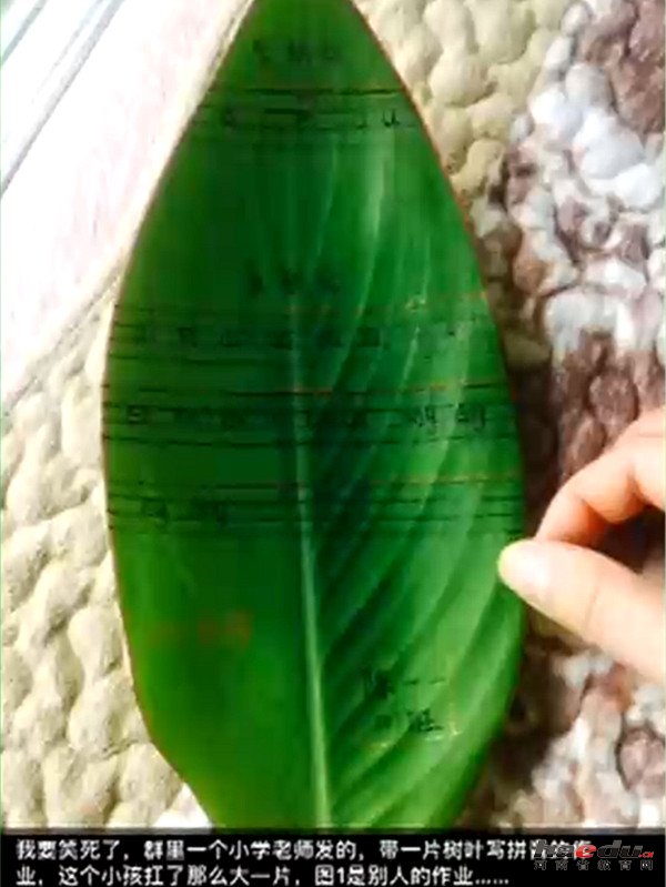 老师让带小鱼到学校观察,结果一位小朋友带了一条草鱼;老师让带肉肉,结果一位小朋友却带了一块五花肉。想必这两张照片,大家应该都在网络上见过。这次又出现了这样一位可爱的小朋友,还刷爆了大家的朋友圈。原来,在某学校的一次课外能力提升作业中,老师要求大家在树叶上写上刚学的汉语拼音,有位小朋友却扛着一片芭蕉叶来交作业,而这一幕正好被学生家长拍到。经过一番打听,这位小朋友是一名一年级的学生。