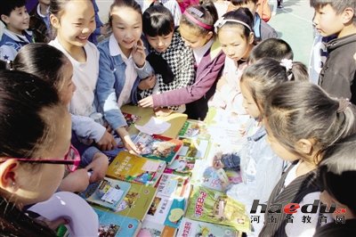 读书月活动,同学们把自己的书拿到学校共享